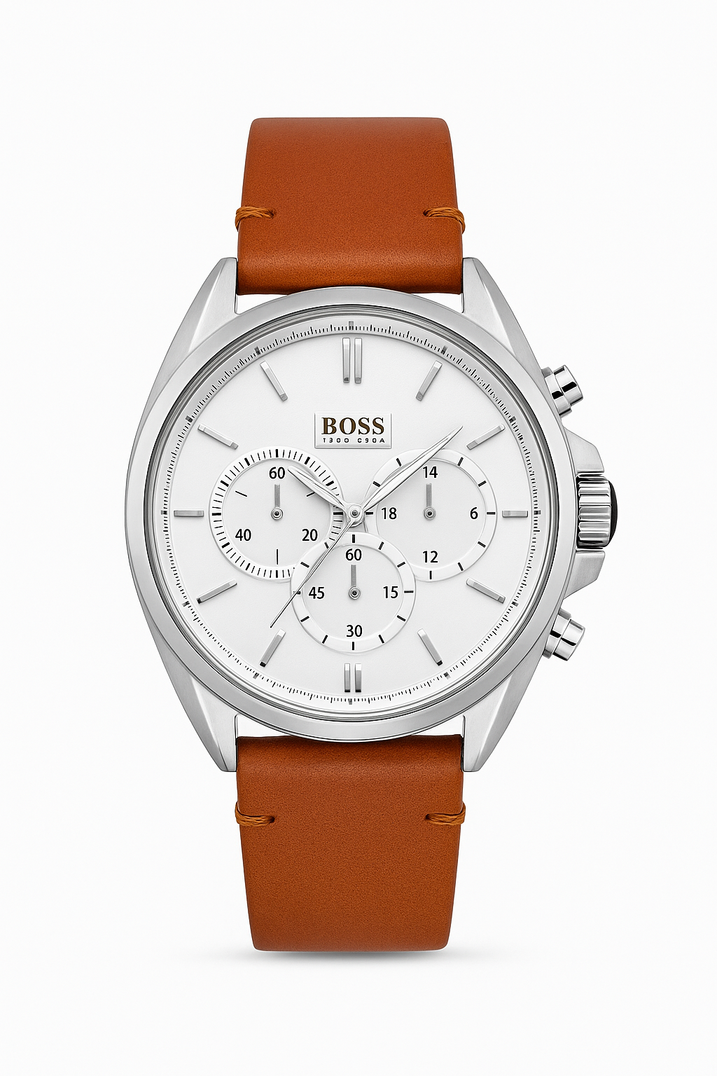 Hugo Boss Chronograph Watch Stainless steel case measuring 46 mm Brown leather perforated strap Three-hand...