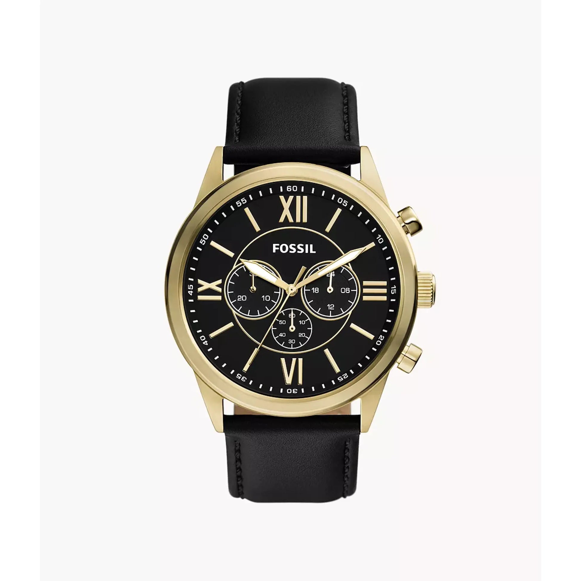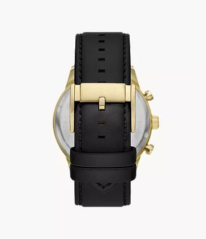 This 48mm Fossil features a black matte dial, chronograph movement and black leather strap. Fossil leather products support responsible manufacturing via the Leather Working Group.